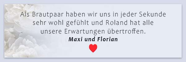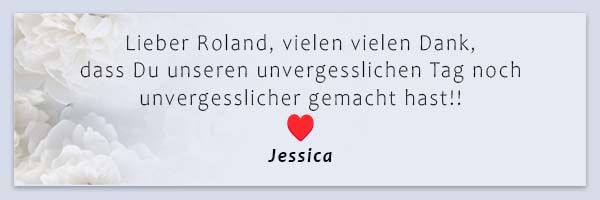 Roland hat das so toll gemacht, dass alle unsere Gäste dachten, wir kennen uns schon Ewigkeiten. Es hat danach jeder gesagt, wie schön die Trauung war. Und wir können die Begeisterung nur bestätigen. Auch als Brautpaar haben wir uns in jeder Sekunde sehr wohl gefühlt und Roland hat alle unsere Erwartungen übertroffen.